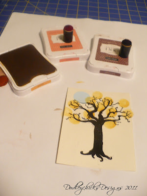 Using sponge daubers add fall foliage colors to the top of the tree. I used three colors here, Honey, Sunset and Chocolate. Start with the lightest color and keep adding until the tree top is fully colored. Use the chocolate dauber to add the ground below the tree as well.